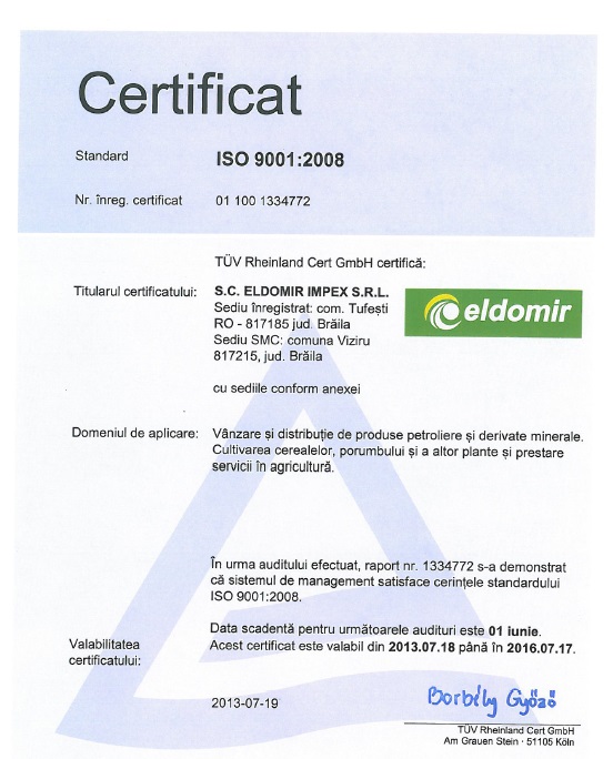 In acest scop, in cadrul societatii Eldomir Impex este proiectat si implementat un Sistem de management al calitatii in conformitate cu cerintele standardului SR EN ISO 9001:2008.